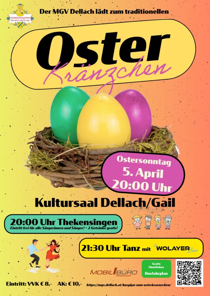 Hier finden Sie den aktuellen Busplan zum Osterkränzchen in Dellach am Ostersonntag, den 05.04.2026! Die beiden Busse fahren bis Liesing i. Lesachtal bzw. Hermagor.